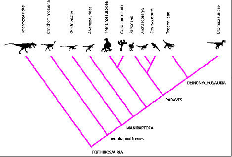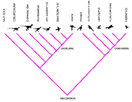 В то же время археоптерикс — ближайший родственник манирапторных динозавров. Ведь у него сохранилась уникальная особенность тероподных динозавров, отличающая их практически от всех наземных четвероногих (в передней конечности первый, второй и третий пальцы, а у веерохвостых птиц в кисти второй, третий и четвертый); а также ряд других признаков: эктоптеригоид и субквадратная форма коракоида; отсутствие четвертого вертлуга и заметное слияние третьего вертлуга с большим на бедре; особенности строения таза с увеличенной передней и уменьшенной задней частью подвздошной кости, с узкой седалищной костью и нижним положением лобковой кости; специализированное строение первых хвостовых позвонков и др.). Некоторые из этих признаков (сохранение эктоптеригоида, субквадратный коракоид, пропорции подвздошной кости) следует отнести к разряду плезиоморфий (древних признаков, унаследованных от общих предков), которые филогенетическая систематика (кладистика) не учитывает при расчете кладограмм, но они свидетельствуют об отдаленном родстве. Необходимо заметить также, что обычно в наборе групп, по которым кладистика ищет родственные связи птиц и динозавров, с одной стороны, отсутствуют псевдозухии и крокодилы, а с другой — современные веерохвостые птицы. В подобной ситуации, нет ничего удивительного в том, что птицы, которых представляют обычно только археоптерикс и энанциорнисы, оказываются в ближайших отношениях с целурозаврами.