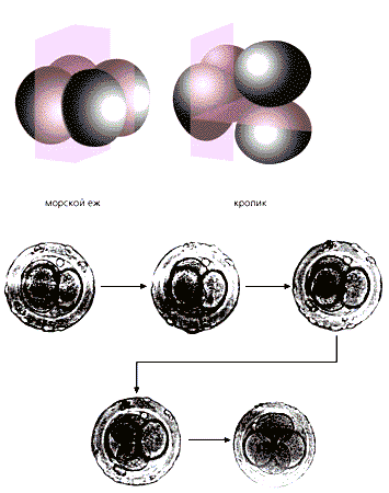 Таким образом, в своем начальном развитии млекопитающие характеризуются многими особенностями, которые резко отличают их от других позвоночных животных и сближают с низшими многоклеточными, а крестообразное расположение клеток на стадии четырех бластомеров наглядно иллюстрирует сходство с палинтомическим делением у колониальных жгутиковых.