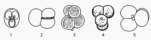 1 — стадия четырех бластомеров, расположенных в виде “палинтомического” креста, сходного с расположением спороцитов при палинтомии у колониальных жгутиковых.Существование геномного импринтинга у организмов, принадлежащих не только к разным типам одного царства, но и к разным царствам живого, заставляет вспомнить Э.Жоффруа Сент-Илера, полагавшего, что все разнообразие развития состоит из разных композиций одних и тех же “строительных кирпичиков”.2, 3 — хаотическое дробление и образование морулы, аналогично дроблению у кишечнополостных.