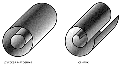 Многослойные нанотрубки отличаются от однослойных бОльшим разнообразием форм и конфигураций. Поперечная структура у них имеет две разновидности, рис.2 [9]. Первую назвали русской матрешкой: она представляет собой коаксиально вложенные друг в друга однослойные цилиндрические нанотрубки. Вторая напоминает скатанный рулон или свиток. Для рассмотренных структур среднее расстояние между соседними слоями, как и в графите, составляет 0.34 нм.