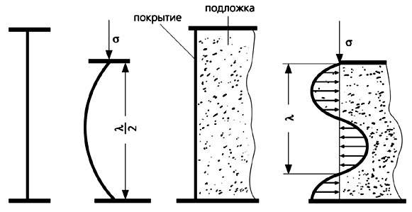 Покрытие, представляющее собой анизодиаметричное твердое тело (т.е. с очень разными размерами в перпендикулярных направлениях), испытывает деформацию одноосного сжатия на поверхности растягиваемой полимерной пленки. Надо сказать, что впервые явления, сопровождающие одноосное сжатие анизодиаметричных твердых тел, были рассмотрены Л.Эйлером более 200 лет назад. Он показал, что тело при достижении критической нагрузки теряет устойчивость и приобретает форму полуволны (так называемая эйлеровская классическая потеря устойчивости). Подобное легко наблюдать, сжимая, например, тонкую металлическую линейку или лист бумаги. Если же анизодиаметричное твердое тело (в нашем случае это тонкое жесткое покрытие) прочно связать с податливой подложкой (основанием), то картина потери им устойчивости решающим образом изменяется. При достижении критической сжимающей нагрузки тело не сможет принять форму полуволны, так как при отклонении от прямолинейной формы на него будет действовать со стороны подложки возвращающая сила, пропорциональная величине отклонения. В результате такого взаимодействия противоборствующих сил покрытие неизбежно сложится, подобно складному метру, и примет синусоидальную форму с периодом волны, равным l.
