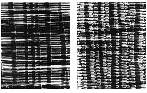Удивительно, что при всем том научном интересе, который проявляют исследователи к подобным системам, до недавнего времени никому не пришло в голову просто растянуть упаковочную армированную пленку (она как раз и представляет собой типичную систему “твердое покрытие на податливом основании”) и посмотреть, что из этого получится. А посмотреть, как оказалось, есть на что: в микроскоп (сканирующий электронный) видны ряды светлых полос с регулярным волнистым рельефом, разделенных темными полосами.