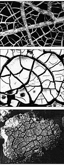 Сетки трещин на разных физических объектах. Сверху вниз:полимерная пленка с тонким металлическим покрытием,подвергнутая плоскостному растяжению;трещины на высыхающей влажной почве