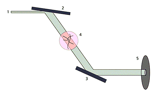 Рис. 1. Схема установки на Курчатовском источнике СИ, иллюстрирующая метод рефракционного контраста. 1 - падающий пучок СИ, 2 - кристалл-монохроматор, настроенный на отражение (511), 3 - кристалл-анализатор, регистрирующий отражение (333), 4 - исследуемый объект, 5 - регистрирующее устройство (детектор на основе ПЗС-матрицы).…Мягкие тканиЦель маммографического обследования - обнаружение и наблюдение за локальными изменениями плотности в мягкой ткани молочных желез. При этом желательно обнаруживать опухоли с малым изменением плотности (порядка нескольких процентов) и малым размером (менее 0.1 мм), что необходимо для ранней диагностики и лечения заболевания. Для существующих методов, включая обычную рентгеноскопию, это оказывается практически невыполнимой задачей.