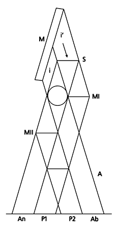 Рис. 4. Cхема “трехцветной” оптики, обеспечивающей одновременное получение изображения по методу фазового контраста (область Р1,Р2), рефракции (An) и поглощения (Ab). М - монохроматор, S - сплиттер, MI, MII - кристаллы, изменяющие направление лучей, А - анализатор. Переход от простых (с точки зрения структуры) маммографических объектов к более сложным, например костям человека, сопровождается как совершенствованием рентгено-оптических методов, так и разработкой алгоритмов для обработки и анализа получаемых изображений. В работе М.Андо с сотрудниками [9] предложен новый метод получения изображений (“трехцветная оптика”), позволяющий одновременно изучать объект в трех видах: в обычном поглощении, в фазово-интерференционном контрасте и по методу рефракции. Идею эксперимента можно понять с помощью рис.4. Первый кристалл - монохроматор - используется для того, чтобы из падающего узкого пучка СИ создать пучок определенной энергии с максимально возможной светосилой. Половина этого пучка (i) направляется непосредственно на объект, а вторая половина (iў) расщепляется на кристалле S (“сплиттер”) еще на два луча. Первый луч (i), испытав поглощение, но не изменив направления, создает абсорбционное изображение в области Ab. Преломленные на границе объекта лучи от сплиттера попадают в область An, где формируется рефракционное изображение. Чтобы обеспечить их попадание в эту область, необходим еще один кристалл MII, который отклоняет их нужным образом. Третье изображение получается с помощью двух лучей от сплиттера: один из них изменяет фазу при взаимодействии с объектом, а другой луч, который через объект не проходит (его направление изменяется кристаллом МI), - нет. Изображение в области Р1 и P2 получается в результате интерференции этих двух пучков после прохождения анализатора А. Такой способ получения изображения называется методом фазового контраста. Как показано в работе [9], комбинация разных методов повышает надежность диагностики и существенно уменьшает ошибки измерений.