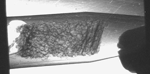 где a - угол между пучком и преломляющей поверхностью, n - показатель преломления, l - длина волны, выраженная в ангстремах. Величина рефракционного контраста определяется относительным локальным изменением интенсивности пучка, испытавшего отклонение на угол a. Для цилиндрического объекта наибольший контраст возникает на его краях, поэтому изображения кажутся объемными (см., например, рис.2). Подробный расчет контраста и дозы облучения для рефракционной интроскопии можно найти в [4].