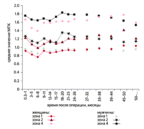 вокруг эндопротеза у мужчин и женщин в зависимости от времени, прошедшего после операции.На смену биохимической лаборатории