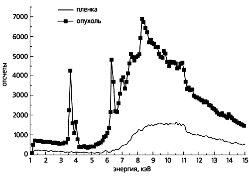 для биожидкости, взятой у больного (опухоль) в сравнении с фоном (пленка).Эти первые результаты были получены сотрудниками Всероссийского научно-исследовательского института экспериментальной физики (г.Саров) совместно с ИЯИ РАН и РНЦ КИ на пучке синхротронного излучения РНЦ КИ по методу рентгеновского флюоресцентного анализа для различных медико-биологических проб. Они показали перспективность предложенного метода.