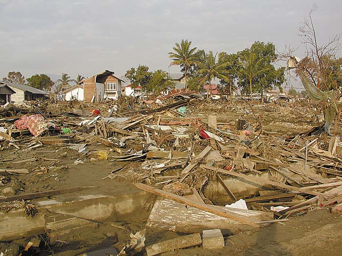 А из того, что услышано, с точки зрения специалиста, я бы выделил сведения о дальности проникновения волны в глубь суши. Во многих телевизионных передачах, особенно из г.Пхукет (Таиланд), подчеркивали, что разрушены отели вдоль берега, а внутри побережья жизнь продолжается, включая обычные вечерне-ночные развлечения. Мало кто обратил внимание на отдельные сообщения о том, что разрушающую силу волна сохраняла на протяжении и полукилометра от берега. А иногда (судя по аэронаблюдениям) она проникала вглубь на 5 км. Так, близ одного из городов Индонезии (Осек?) волна унесла пароход весом несколько тонн на 5 км от берега. Один из русских туристов сообщил, что его волной унесло на 10 км от отеля. В провинции Ачех на Суматре, наиболее близко оказавшейся к очагу землетрясения, волна смыла все на расстоянии 15 км от моря.