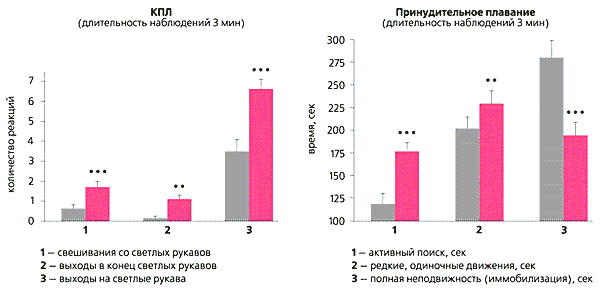 Рис. 4. Результаты тестирования белых крыс на фоне введения b-казоморфина-7. В крестообразном приподнятом лабиринте (КПЛ) у экспериментальных животных (цветные столбики) по сравнению с контрольными (серые столбики) значительно возросло количество реакций, свидетельствующих о снижении тревожности. В условиях “принудительного плавания” проявления депрессивности явно ослаблены. Метки ** и *** указывают на высокий уровень достоверности выявленных отличий опытной и контрольной групп (вероятность ошибки меньше 1% и 0.1% соответственно). Тестирование проводилось в трехмесячном возрасте.В тесте “принудительное плавание” крысу помещают на фиксированное время в цилиндрическую емкость с водой (28°С) и наблюдают за ее реакцией. Как правило, вначале животное активно плавает и старается выбраться из цилиндра, чему мешают высокие бортики. Попытки становятся все реже, короче, и обычно через 3-5 мин крыса неподвижно зависает в воде, прекратив “сопротивление”. То, как быстро это произойдет, служит мерой депрессивности животного и показывает, насколько мотивирован поиск способа покинуть неприятную среду. Здесь уместно вспомнить сказку о двух лягушках, упавших в сметану. Одна из них (более “депрессивная”) быстро прекратила сопротивление и утонула; вторая же, постоянно двигаясь, сбила масло и спаслась. Согласно нашим данным, животные, получавшие b-казоморфин-7, даже спустя два с половиной месяца активнее, чем контрольные, и более “упорны” в поисках выхода из потенциально опасной ситуации (рис. 4, справа). Сходное действие на поведение животных и человека оказывают все классические препараты-антидепрессанты.Другая сторона проявления благоприятной нейротропной активности опиоидных фрагментов молочных белков - усиление привязанности детеныша к матери. Как известно, близость к ней служит для новорожденного особым видом положительного подкрепления. Детеныш воспринимает мать не только как источник тепла и пищи, но и как фактор, с которым стремится быть в контакте (тактильном, обонятельном, визуальном, звуковом). Нарушение либо неполное выполнение этой врожденной программы может привести в дальнейшем к зоосоциальной дезадаптации: молодое животное не сможет нормально общаться с родителями, соседями по стае, потенциальными половыми партнерами.