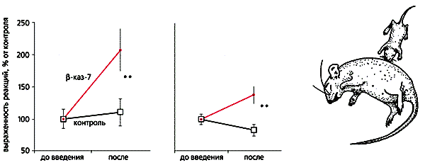 Оказалось, что в контрольной группе результаты двух последовательных тестирований зависимых от матери реакций очень близки: их проявления могут немного возрастать либо ослабляться, но в целом меняются незначительно. Однако такие изменения более выражены, если воздействовать на опиоидные рецепторы. Так, их классический блокатор налоксон (в клинике его применяют для устранения последствий передозировки опиатов) достоверно ослаблял детское поведение. Этот препарат выключает эндогенную опиоидную систему мозга, чье участие в запуске зависящих от матери реакций достаточно хорошо установлено. Использование b-казоморфина-7, напротив, усиливало детское поведение: латентные периоды реакций заметно сокращались, а интенсивность клайминга увеличивалась в обеих возрастных группах (рис. 5, слева).