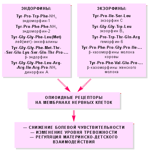 Рис. 2. Аминокислотный состав эндорфинов и экзорфинов и основные эффекты их действия.