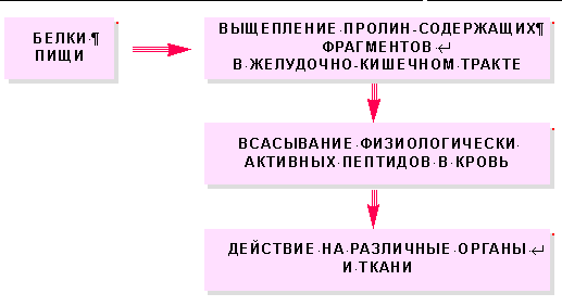 Многие гормоны и медиаторы представляют собой относительно короткие фрагменты белковых молекул - пептиды. Соответственно, всегда существует вероятность, что в составе пищевого белка найдутся аналогичные последовательности. Если они должным образом защищены от переваривания (например, остатками аминокислоты пролина), то, выщепляясь при распаде белка в желудочно-кишечном тракте, эти фрагменты проникают в кровь и действуют как специфические регуляторы (рис.1).