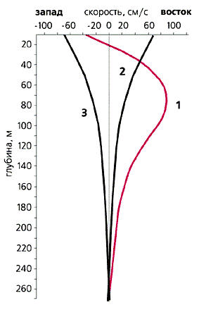 Скорости течения в пункте I (140°з.д.): средней многолетней (1), переменного течения на восток (2), на запад (3). Крупномасштабные течения представляют собой сложную систему изменяющихся с глубиной и во времени течений. Всегда и везде на поверхности океана крупномасштабное течение имеет скорость ~30 см/с и направлено на запад, с глубиной его скорость быстро уменьшается и уже на горизонте ~20 м равна нулю. Глубже направление течения становится восточным, и на глубине ~80 м скорость достигает максимальной величины ~90 см/с, а затем снова уменьшается до нулевых значений на горизонте 260 м [7]. Это течение с максимальными скоростями на горизонте 80 м названо подповерхностным течением Кромвелля. На экваторе расход подповерхностностного течения на восток в среднем многолетнем режиме приблизительно в 50-100 раз больше поверхностного на запад. Большие скорости течений наблюдаются только в узкой, до 2° к северу и югу, приэкваториальной зоне океана, а за пределами этой зоны они малы (в среднемноголетнем режиме). В течение года меняются скорость и направление течений (так называемая годовая изменчивость). Существуют данные, что у поверхности океана скорости переменных течений достигают ~70 см/c, как в восточном, так и в западном направлениях [7].