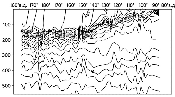 Распределение температуры воды (в градусах Цельсия) по вертикальному сечению Тихого океана вдоль экватора [13].