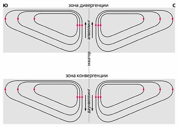 Циркуляция вод в вертикальной плоскости, перпендикулярной экватору, создаваемая волнами Россби: