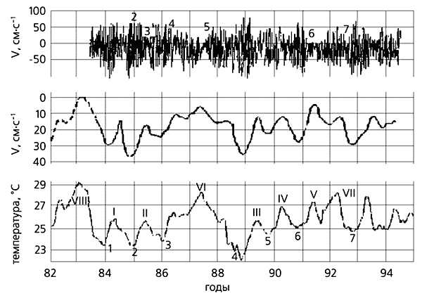 Характеристики скорости течений и температуры поверхности океана в пункте I (140°з.д.). Меридиональная составляющая скорости течений (фактически течений волн Россби), измеренных на горизонте 25 м (вверху), среднеквадратическая за половину года величина этих течений волн Россби (в середине), температура поверхности океана (внизу). Римскими и арабскими цифрами отмечены моменты времени. Пояснение в тексте.Эта связь хорошо заметна при визуальном рассмотрении поведения параметров волн Россби. Так, моментам 1, 2, 3, 4, 5, 6, 7 соответствует низкая температура воды ~24°C (нижний график) и четкие модуляции с волнами Россби с большой амплитудой колебаний скорости течения (например, верхняя кривая, модуляция 1-2-3). Такое состояние среды наблюдается при Эль-Ниньо. В это время крупномасштабные течения направлены на запад, и их скорости достигают максимальных значений. Моментам I, II, III, IV, V соответствует слабое Эль-Ниньо, при этом средняя температура поверхности воды ~27°C и волновые колебания в модуляциях непродолжительное время имеют малые амплитуды. В это время крупномасштабное течение направлено на восток и его скорости максимальны. Моментам VI, VII, VIII соответствует сильное Эль-Ниньо, высокая температура воды ~29°С и волновые колебания течений с малыми амплитудами продолжительное время и малыми скоростями крупномасштабных течений. Такая ситуация наблюдается, например, между моментами времени 4-5 (верхний график) и моментами 6-7.Таким образом, температура на поверхности океана и является показателем развития Эль-Ниньо - Ла-Нинья, зависит от амплитуды колебания скорости течения волн Россби и, естественно, от параметров связанных с ними крупномасштабных течений.