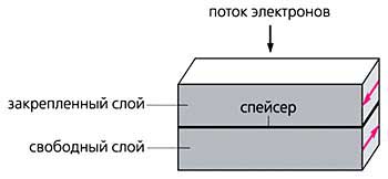 Сущность ожидаемых эффектов состояла в следующем. Перенос электронов при протекании электрического тока в ферромагнитном проводнике сопровождается переносом потока спинового момента количества движения и связанного с ним потока магнитного момента. В таком потоке направление спинового магнитного момента электронов параллельно направлению магнитного момента решетки, поскольку это соответствует минимуму энергии sd-обменного взаимодействия (подробнее об этом речь пойдет ниже). При переходе электронов из одного ферромагнитного слоя спинового вентиля в другой, имеющий иную ориентацию магнитного момента решетки, былая параллельность нарушается, и электрону приходится менять ориентацию спина, чтобы "приспособиться к новым условиям". Параллельность восстанавливается на малом расстоянии от границы раздела между ферромагнетиками, в слое толщиной ~1 нм. Этот процесс сопровождается передачей спинового момента количества движения от электронов к решетке. Важно подчеркнуть, что даже при коллинеарной (параллельной или антипараллельной) ориентации намагниченности обоих слоев в свободном слое имеются флуктуации намагниченности (вектор магнитного момента одного или нескольких атомов отклоняется от равновесного положения). По отношению к таким моментам спин электронов, входящих в свободный слой, имеет как продольную, так и поперечную компоненты. Поскольку величина передаваемого в процессе взаимодействия момента пропорциональна плотности тока через переход, при определенной плотности тока возникает неустойчивость флуктуаций намагниченности решетки, которая и приводит к переключению.