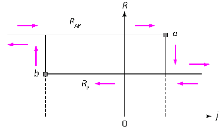 Рис. 2. Зависимость сопротивления R магнитного перехода от плотности тока j (RP - сопротивление при параллельной ориентации слоев, RAP - сопротивление при антипараллельной ориентации). Стрелками показано направление изменения тока, точка a отмечает переключение в параллельную конфигурацию, точка b - обратный переход. В Институте радиотехники и электроники РАН исследования в области спиновой электроники ведутся с 2000 г. Основное внимание было уделено альтернативному механизму влияния тока на состояние магнитного перехода. Механизм Берже-Слончевского учитывал лишь поперечную (по отношению к намагниченности переключаемого слоя) компоненту спинового потока, сопровождающего протекание тока. Что касается продольной компоненты, то ею пренебрегали, так сказать, по идейным соображениям: считалось, что электроны, спин которых коллинеарен магнитному моменту решетки, не могут заставить решетку изменить свою ориентацию.