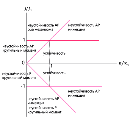 Рис. 3. Области устойчивости/неустойчивости параллельной (Р) и антипараллельной (АР) конфигураций при различных значениях плотности тока j и коэффициента затухания k. Границы областей показаны цветными линиями. Указан механизм, вызывающий неустойчивость. j0 - пороговая плотность тока, k0 - критическое значение коэффициента затухания, разделяющее области доминирования двух различных механизмов. Положительное направление тока соответствует движению электронов от закрепленного слоя к свободному. Тогда возникает другой вопрос: существуют ли у этих механизмов какие-либо специфические проявления, позволяющие их опознать и различить? Положительный ответ на этот вопрос дало исследование зависимости частоты (ее вещественной части) флуктуаций от плотности тока, протекающего через магнитный переход. В случае инжекционного механизма по мере приближения к порогу неустойчивости происходит понижение ("смягчение") частоты флуктуаций, а при достижении порога она обращается в нуль, т.е. переключение происходит в апериодическом режиме (рис.4). Что касается крутильного механизма Берже-Слончевского, то здесь влияние тока на частоту флуктуаций отсутствует.