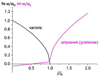Рис. 4. Зависимость вещественной (Re) и мнимой (Im) части частоты флуктуаций w от плотности тока (w0 - частота спиновых волн в отсутствие тока, j0 - пороговая плотность тока). "Смягчение" собственных частот колебаний характерно для так называемых фазовых переходов второго рода, при которых, начиная с некоторого значения одного из параметров (например, ниже некоторой определенной температуры), в системе возникает спонтанное нарушение симметрии. Примером может служить возникновение спонтанной намагниченности в ферромагнетиках или спонтанной электрической поляризации в сегнетоэлектриках ниже точки Кюри; появление выделенного направления соответственно магнитного или электрического дипольного момента означает, что симметрия системы понижается. Инжекционный механизм переключения магнитного перехода - это, по существу, такой же переход, только происходящий в неравновесных условиях - при протекании электрического тока; аналогом точки Кюри служит пороговая плотность тока.