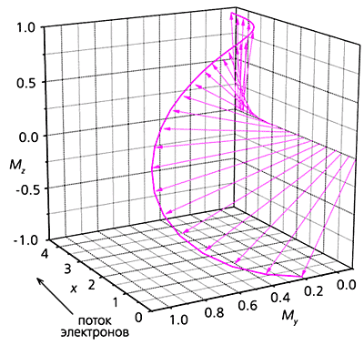 Рис. 5. Неоднородное переключение намагниченности свободного слоя при протекании тока в условиях спиновой инжекции. Стрелками показано направление магнитного момента решетки M = (0, My, Mz) на различных расстояниях от границы с закрепленным слоем при x = 0 (за единицу расстояния в направлении тока выбрана длина релаксации продольной составляющей спина). По мере увеличения плотности тока, начиная с порогового значения, магнитный момент на границе антипараллельно ориентированных слоев начинает отклоняться от первоначального направления тем сильнее, чем больше превышение плотности тока над пороговым значением. Зависимость угла отклонения от плотности тока имеет в точности такой вид, как зависимость параметра, характеризующего нарушение симметрии (его называют параметром порядка), от управляющего параметра (например, температуры) при фазовом переходе. В зависимости от соотношения между сопротивлениями перехода и внешней цепи этот угол начинает увеличиваться на пороге неустойчивости либо начиная с нуля, как в случае фазового перехода второго рода (рис.6), либо скачком, как в случае фазового перехода первого рода (рис.7).