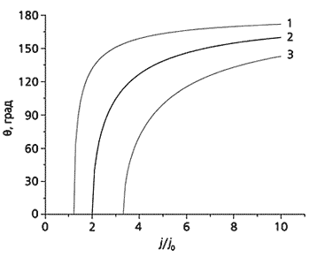 Рис. 6. Зависимость угла поворота вектора намагниченности на границе слоев q от плотности тока через переход при различных значениях внешнего магнитного поля Н. 1 - H/Ha = 0.5, 2 - H/Ha = 3, 3 - H/Ha = 10 (j0 - пороговая плотность тока, Ha - поле анизотропии).