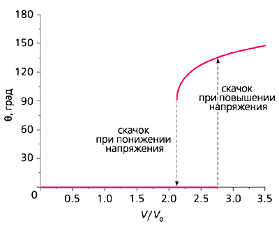 Рис. 7. Зависимость угла поворота границы слоев q от напряжения V на переходе (V0 - напряжение на переходе при пороговой плотности тока для параллельной конфигурации перехода). Штриховыми линиями показаны скачкообразные изменения угла при повышении и понижении напряжения. Изменение магнитной конфигурации свободного слоя приводит к изменению сопротивления перехода, и оказывается, существуют условия, при которых на вольтамперной характеристике появляется петля гистерезиса (рис.8). Зависимость тока от напряжения приобретает бистабильный характер (одному и тому же значению напряжения соответствуют два возможных значения тока, и реализация одного из них определяется предысторией, т.е. порядком проведения измерений) - получается система с двумя состояниями динамического равновесия. Системы такого рода всегда представляли интерес для радиотехники.
