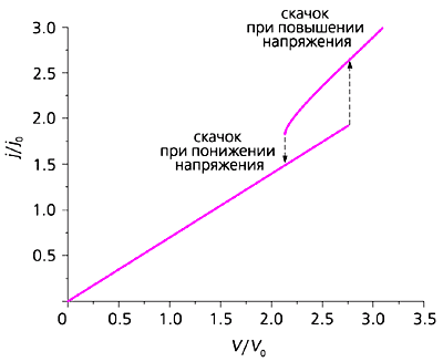 Рис.8. Бистабильная вольтамперная характеристика магнитного перехода (j0 - пороговая плотность тока, V0 - напряжение на переходе при пороговой плотности тока для параллельной конфигурации перехода). В настоящее время в нашем институте проводится работа по поиску условий повышения эффективности спиновой инжекции, что позволило бы существенно понизить порог неустойчивости, т.е. реализовать переключение при более низкой плотности электрического тока. Заманчивой перспективой представляется также получение инверсии заселенности спиновых подзон в результате инжекции неравновесных спинов, что открывало бы возможность усиления и генерации излучения в области 1012-1013 Гц. Такие частоты могут найти применение для эффективной накачки сверхмощных волоконно-оптических лазеров для использования в различных технологических процессах, а также в химии и биологии.