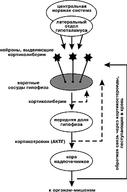Итак, нейропептид кортиколиберин, действуя на переднюю часть гипофиза (нижнего придатка мозга), вызывает секрецию другого пептидного гормона - кортикотропина. Тот в свою очередь стимулирует кору надпочечников, вырабатывающую гормоны иной химической природы - кортикостероиды, оказывающие мощное влияние на все органы и ткани, включая и головной мозг. Под воздействием кортикостероидов в организме развивается стресс-реакция: усиливаются обменные процессы, подавляются иммунные и воспалительные реакции, меняется концентрация нейропередатчиков в различных отделах мозга, повышается секреция и кислотность желудочного сока и др. Легко проникая в головной мозг, стероидные гормоны тормозят выработку кортиколиберина, и стрессорная реакция затухает как бы сама собой, по принципу отрицательной обратной связи. |