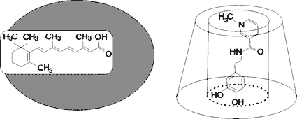 Гидрофобные соединения, естественно, плохо растворимы в воде (общее правило: чем лучше вещество растворяется в мембране клеток, тем хуже — в воде). С этим связаны трудности, которые возникают при создании в кровотоке нужных концентраций гидрофобных лекарств. Для повышения биодоступности надо подобрать подходящий переносчик. Как природа решила эту проблему? Ведь существуют гидрофобные, не растворимые в воде витамины (А, Д, Е), гормоны (тироксин, половые гормоны), липиды (холестерин, жиры), которые нужно переносить от места синтеза ко всем клеткам. Для каждого из таких веществ существуют белки-переносчики, а для холестерина — контейнеры: липопротеины, состоящие из многих тысяч молекул. Они хорошо растворимы в воде, так как на их поверхности экспонированы полярные аминокислоты, и имеют “карманы”, выстланные гидрофобными аминокислотами. Химики для этих целей предложили циклодекстрины, у которых поверхность гидрофильная, а полость гидрофобная. Именно в эту полость могут включаться гидрофобные соединения соответствующего размера.