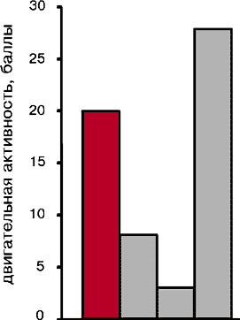 Сравнение двигательной активности мышей различных групп. Действие липосомного препарата ДОФА на мышей с синдромом Паркинсона (выделено цветом) вызвало более выраженный антипаркинсонический эффект по сравнению с раствором этого препарата (второй столбик слева). Контролем служили больные и здоровые животные, которым вводили только физраствор (третий и четвертый столбики соответственно).Не имея гербовой, пишем на простой