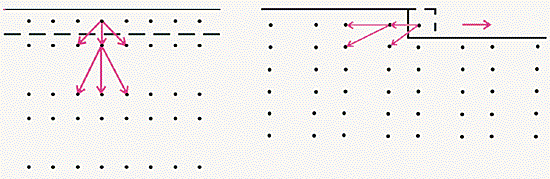 справа - относительно ступени на его поверхности.Посмотрим на кристалл, изображенный на рис.1. Показанные позиции в нем неупорядоченно заполняются двумя типами атомов. Все позиции абсолютно эквивалентны в объеме кристалла, однако они могут стать геометрически и энергетически неэквивалентными на его поверхности. Эту неэквивалентность можно легко увидеть, сравнив длину связей атома, встраивающегося в кристалл, и атомов, уже находящихся в объеме кристалла (стрелки между атомами на рисунке). Если определенная позиция заполняется атомами только одного сорта, то данный эффект не может сказаться на росте кристалла. Однако если позиция заполняется атомами нескольких сортов, то возникшая неэквивалентность позиций может привести к их упорядоченному заполнению изоморфными атомами, свойства которых различны, и первая позиция может стать более выгодной для одного сорта атомов, а вторая - для другого. В поверхностном слое кристалла формируется упорядоченное состояние. Затем этот слой перекрывается новыми, и таким образом заполняется объем кристалла. Но в объеме все позиции строго эквивалентны, поэтому возникшее упорядоченное состояние - термодинамически неустойчиво, метастабильно. Однако переход от упорядоченного метастабильного состояния к неупорядоченному равновесному может происходить чрезвычайно медленно, так как скорость диффузии в твердом теле очень мала.