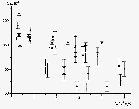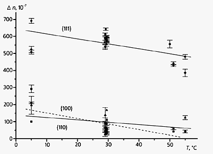 Рис. 5. Зависимость величины аномального двупреломления (Dn) квасцов K(Al,Cr)(SO4)2·12H2O от скорости роста кристалла в разных секторах: октаэдра {111}, ромбододекаэдра {110} и куба {100}. Незакрашенные значки соответствуют росту при естественной конвекции, черные - при интенсивном перемешивании раствора.Возникновение наиболее упорядоченной (т.е. наиболее неравновесной) структуры при наименьших отклонениях от равновесия - факт достаточно неожиданный с точки зрения термодинамики, которая предполагает формирование равновесной фазы при минимальных отклонениях от термодинамического равновесия, т.е. при очень низких скоростях роста кристалла.Отжиг кристалла