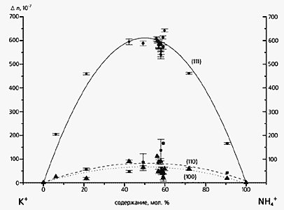Рис.3. Зависимость величины аномального двупреломления (Dn) квасцов (K,NH4)Al(SO4)2·12H2O от их состава в разных секторах роста: октаэдра {111}, ромбододекаэдра {110} и куба {100}.Кроме соотношения концентраций изоморфных ионов на диссимметризацию влияет и концентрация различных примесей. Так, возможно изменение степени ростовой упорядоченности в кристаллах гранатов и кордиерита в зависимости от присутствия небольших количеств примесей в среде кристаллизации.Влияние температуры и скорости роста кристалла