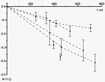 Рис.6. Степени полноты реакции отжига при температуре 50°С (x = 1 – Dn/Dn0, где Dn и Dn0 - текущее и начальное значение величины двупреломления в кристалле) в зависимости от длительности эксперимента (t). Пунктиром соединены точки, полученные для кристаллов изоморфного ряда (NH4,K)Al(SO4)2·12H2O.* * * Может создаться впечатление, что явление ростовой диссимметризации полностью изучено и больше не таит в себе загадок. Однако это далеко не так. Механизм ростовой диссимметризации, продемонстрированный на рис.1, к сожалению, не имеет прямых экспериментальных доказательств, хотя для некоторых кристаллов (квасцов, гранатов, топаза, кварца) существует большое количество подтверждающих косвенных данных. Следующим этапом в исследовании ростовой диссимметризации должно стать подробное изучение поверхности растущего кристалла, сравнение предпочтительности одних структурных позиций перед другими и сопоставление с данными рентгеноструктурного анализа. Только такой подход может дать надежные экспериментальные доказательства*.* Дополнительная информация по данной теме и необходимая библиография имеются в обзорной статье: Штукенберг А.Г., Пунин Ю.О. Оптические аномалии в кристаллах // Зап. Всесоюз. минералог. общ-ва. 1996. Ч.125. №4. С.104-120.Работа выполнена при частичной финансовой поддержке Российского фонда фундаментальных исследований. Проект 96-05-65577.