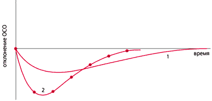 Отклонения общего содержания озона (ОСО), обусловленные выбросами газов 1 и 2. Отсчет времени начинается с момента осуществления залпового выброса. Газ 1 (фреон-11 или -12) вызывает относительно небольшое падение ОСО, но последствия его выброса сказываются достаточно долго. Воздействие газа 2 (фреон-22) - более сильное и кратковременное. Площади фигур, образованных горизонтальной осью и каждой из кривых, отражают суммарный эффект на ОСО от выброса газов 1 и 2 соответственно, а отношение этих площадей, называемое озоноразрушающим потенциалом, показывает, насколько более (или менее) эффективно разрушается атмосферный озон газом 2, чем газом 1.Это, казалось бы, успешное решение озонной проблемы подтолкнуло к принятию в конце 1997 г. в Киото протокола, устанавливающего и регламентирующего снижение выброса в атмосферу парниковых газов (и прежде всего углекислого газа). Каждой из стран-участниц предписано в 2008-2012 гг. снизить выбросы CO2 на "n%" относительно уровня 1990 г. Например, для США это 7%, для Канады и Японии 6%, для стран Европейского Союза 8% и т.д. Однако каждая страна выбрасывает в атмосферу не только СО2, но и другие газы, воздействующие на коротковолновое и тепловое (длинноволновое) излучения и тем самым формирующие парниковое потепление климата.Как же определить вклад того или иного радиационно-активного газа, попадающего в атмосферу? А возвращаясь к разрушающим озон химикатам: какой из них более, а какой менее опасен для него? Очень трудно математически корректно описать многочисленные процессы, присущие такой сложной системе, как Земля-атмосфера (это и химические превращения, и перенос воздушных масс во всех направлениях, и смена фазовых состояний веществ, и испарение, и осадки и т.п.). Еще сложнее удовлетворительно охарактеризовать состояние системы одним или несколькими числами. Для этого из всего комплекса процессов необходимо выделить единственный, подлежащий оценке, который к тому же должен иметь простую и наглядную интерпретацию, понятную неспециалистам, поскольку использовать его предстояло в первую очередь не ученым, а политикам, промышленникам, экономистам. В результате были предложены и одобрены два критерия - озоноразрушающий потенциал (ОРП) и потенциал глобального потепления (ПГП), которые впоследствии легли в основу ограничений, зафиксированных Монреальским протоколом, его дополнениями, и Киотским протоколом. Остановимся на них подробнее.