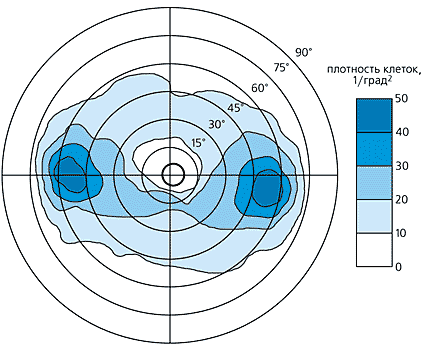 Карта сетчатки дельфина (черноморской афалины), показывающая распределение плотности расположения ганглиозных клеток в разных участках (в расчете на градус угла поля зрения). Хорошо видны два пятна максимальной плотности - две зоны наилучшего видения. Числами на карте уазано расстояние от центра сетчатки.Так обнаружилось самое главное различие между дельфинами и другими животными: у дельфинов каждый глаз имеет не одну зону наилучшего видения, а две [2, 5]. Расположены они не в центре сетчатки, а по краям, приблизительно на одинаковом расстоянии от центра: одна зона - в передней части сетчатки (той, что ближе к носу, - назальной), другая - в задней (той, что ближе к уху, - височной). Это действительно самые настоящие зоны наилучшего видения: концентрация нервных клеток там в десятки раз выше, чем в других частях сетчатки.Насколько нам известно, среди всех млекопитающих, у которых была исследована сетчатка (а их уже довольно много), это единственный случай, когда сетчатка имеет две зоны наилучшего видения. У всех остальных зона наилучшего видения может быть разнообразной по форме, но всегда только одна.