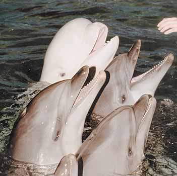 Афалины и белуха (на заднем плане). При рассматривании объекта (в данном случае руки дрессировщицы) над поверхностью воды дельфины чаще всего поворачиваются к нему носом, при этом изображение проецируется на заднюю часть сетчаток обоих глаз.И в заключение немаловажный вопрос: а зачем, собственно, все это нужно? Какое нам дело до того, хорошо видит дельфин или плохо? Нам бы хоть со своими собственными глазами разобраться, понять, как их сохранить и как лечить. Вот именно для этого все и нужно. Чтобы решать проблемы своего собственного зрения, важно понять, как в процессе эволюции создавалась та или иная часть, та или иная функция глаза. А сделать это можно только одним способом: изучая и сравнивая зрение у разных животных, чтобы из фрагментов воссоздать целостную картину эволюции зрительной системы. И зрение дельфинов - очень своеобразный, а потому и ценный фрагмент всей этой мозаики. А если при этом еще удастся удовлетворить законное любопытство и узнать, не двоится ли в глазах у дельфина, - тем лучше.Работа выполнена при поддержке Российского фонда фундаментальных исследований.