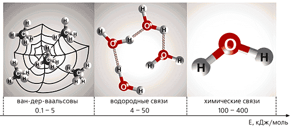 Отличительная черта водородной связи - сравнительно низкая ее энергия, она почти на порядок ниже энергии химической связи и занимает промежуточное положение между химическими связями и ван-дер-ваальсовыми взаимодействиями, которые удерживают молекулы в твердой или жидкой фазе (рис.1).