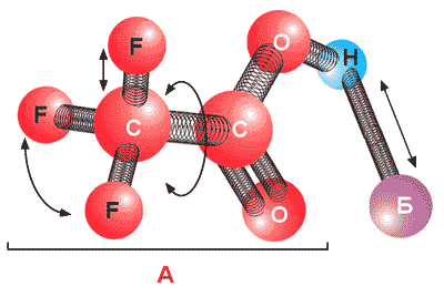 Рис. 2. Модель комплекса трифторуксусной кислоты с акцептором протона.При исследовании Н-связей информативна также ЯМР-спектроскопия. Изменение химического сдвига d-протона и его спин-спиновое взаимодействие с соседними ядрами позволяют определить некоторые параметры этой связи.