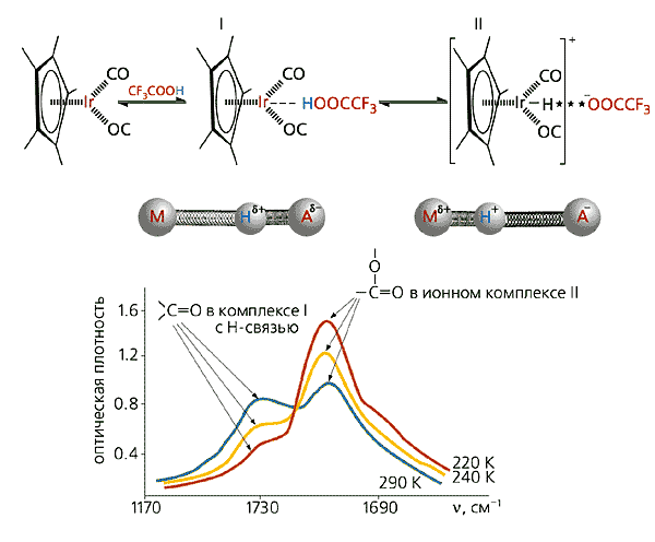 Мы выбрали сначала комплекс иридия, а в качестве донора протонов - трифторуксусную кислоту (CF3COOH) и наблюдали за превращениями в системе при разных температурах. Индикатором превращений послужила полоса в ИК-спектрах, соответствующая колебаниям карбонильной группы C=O в трифторуксусной кислоте (рис.3). На первой стадии возникает Н-связь с атомом металла, на что указывает полоса валентных колебаний n=1730 см-1 в комплексе I (та же группировка без Н-связи имеет заметно более высокую частоту колебаний: n=1780-1800 см-1). При понижении температуры металл протонируется и образуется обычная s-связь М-Н. Все превращения обратимы, протон как бы зажат между двумя пружинками и может передвигаться влево либо вправо в зависимости от температуры. Металлокомплекс II, принимая протон, становится катионом.