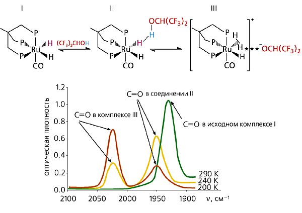 и ИК-спектры комплексов рутения.Все превращения обратимы: при низкой температуре равновесие смещено в сторону образования комплекса с молекулярным водородом, о чем свидетельствует увеличение интенсивности полосы в области 2020 см-1) для комплекса III; при повышении температуры равновесие сдвигается к исходному соединению, на это указывает увеличение интенсивности полосы 1920 см-1 исходного гидридного комплекса I. Промежуточное соединение - диводородный комплекс II (полоса 1950 см-1) - в зависимости от температуры плавно переходит либо в исходное, либо в конечное соединение (полоса 2020 см-1) [3].