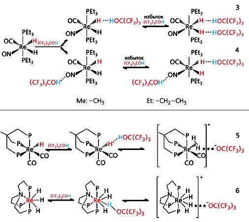 Если в комплексе рения присутствует лиганд с высокой акцепторной способностью, например Cl-, протон в первую очередь направляется к нему (рис.5, схема 1). Затем, при избытке протонного донора, возникает диводородная связь с участием гидридного водорода. Если Cl- отсутствует, два гидридных водорода один за другим образуют такую же связь (рис.5, схема 2). Теперь заменим метильные группы в фосфиновых лигандах этильными. В комплексе с такими лигандами Н-связи могут возникать как с NО, так и с одним из гидридных водородов (рис.5, схемы 3 и 4). Второй же вовлекается в образование связи лишь при избытке донора.