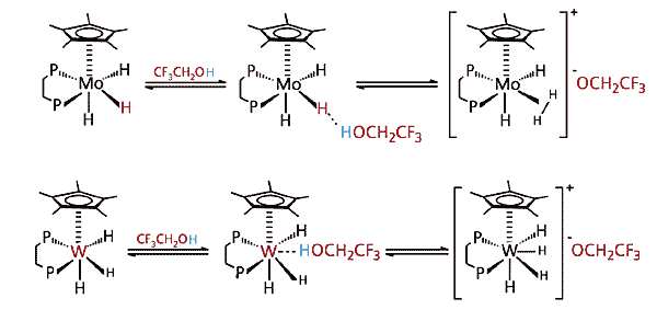 Системой можно управлять, меняя не только лигандное окружение, но и атом металла в комплексе. Так, если это молибденовый комплекс, то он содержит гидридные водороды с довольно высокой основностью. Поэтому легко образуется диводородная связь (рис.6). Если молибден заменить вольфрамом, имеющим большую основность, гидридные водороды не выдержат конкуренции, и предпочтительным окажется образование Н-связи с металлом (рис.6).