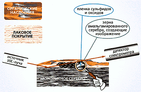 Для нас такой способ был неприемлем, поскольку слой металлического серебра, на котором находится само изображение, непрозрачен для ИК-излучения. И мы решили использовать методику зеркального отражения: луч проходит через слой органических продуктов, пленку коррозии, отражается от поверхности серебра и попадает в детектор спектрографа.