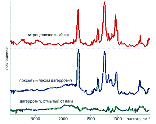ИК-спектры нитроцеллюлозного лака, покрытого им дагерротипа и того же образца, отмытого от лакаПо результатам подобного анализа выяснилось, что в некоторых случаях использовались растворы шеллака — воскоподобного вещества, выделяемого тропическими насекомыми из семейства лаковых червецов. Спектральным методом в дальнейшем мы контролировали степень удаления загрязнений и лаковых покрытий, иными словами, оценивали результативность выбранного способа очистки.