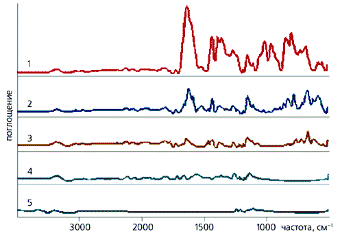 ИК-спектры дагерротипов при их постадийной обработке разными реагентами. С исходного дагерротипа (1) сначала снимали органические наслоения детергентами и органическими растворителями (2), затем удаляли продукты коррозии серебра, действуя тиомочевиной, фосфорной кислотой и диметилформамидом (3). Чтобы очищенный таким способом дагерротип “законсервировать”, обрабатывали перекисью водорода его поверхность (4), а потом ее восстанавливали с помощью боргидрида (5).Собственный опыт по восстановлению дагерротипов в сочетании с некоторыми современными положениями химической науки привел нас к следующему выводу: воздействие атмосферных примесей резко усиливается в присутствии, как говорят химики, следовых (т.е. очень малых) количеств органических и неорганических веществ. Именно они катализируют процесс старения — реакции, которые приводят к образованию оксидов и сульфидов серебра и протекают в стыках монокристаллов металла на его поверхности. В соответствии с общими законами катализа, при удалении этих каталитических соединений чувствительность поверхности к химическим воздействиям снижается в тысячи раз.Значит, нужно было “законсервировать” очищенные диметилформамидом дагерротипы, т.е. предотвратить катализ старения, разрушив “следы” оставшихся на поверхности изделий агрессивных веществ до более простых и легко удаляемых. И мы использовали перекись водорода. Подобный подход для очистки поверхности серебряных изделий никогда ранее не применялся и даже не предлагался. На первый взгляд он кажется нелогичным: ведь на предыдущих этапах мы удаляли продукты окисления, а здесь действовали сильным окислителем. Однако для серебра такая обработка не только полезна, но и безопасна, так как оно неспособно столь простым путем быстро образовывать оксид.