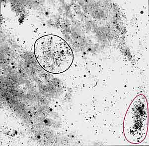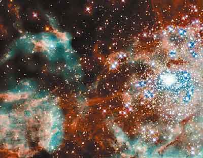 Важно отметить, что все достаточно близкие сверхассоциации всегда можно разбить на отдельные ассоциации (30 Dor в Большом Магеллановом Облаке, например, содержит не менее 19 ассоциаций, собранных в трех группах, три богатых молодых скопления и много небольших скоплений [7]). Самое заметное - очень молодое скопление NGC 2070, которое уже столь массивно, что его можно, если угодно, назвать сверхскоплением (рис.4).