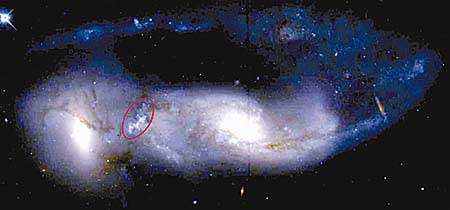 Столкновения газовых облаков при взаимодействии галактик, вероятно, служат причиной формирования сверхассоциаций и сверхскоплений, поскольку повышение плотности газа - необходимое условие возникновения в нем звезд и скоплений. Особенно ярко это видно на примере гигантского комплекса, который содержит около 40 молодых весьма массивных скоплений; он открыт недавно между почти соприкасающимися галактиками NGC 6621 и NGC 6622 и обнаруживает собственное вращение [10]. Именно такие структуры и следовало бы называть звездными сверхскоплениями (рис.5). Интенсивное звездообразование близ центра галактик часто связано с их взаимодействием, в процессе которого некоторые газовые облака теряют момент количества движения и оседают к центру. Падение быстрых облаков на диск галактики также приводит к повышению плотности газа и появлению областей активного синхронизированного звездообразования (к этой возможности мы вернемся позже).